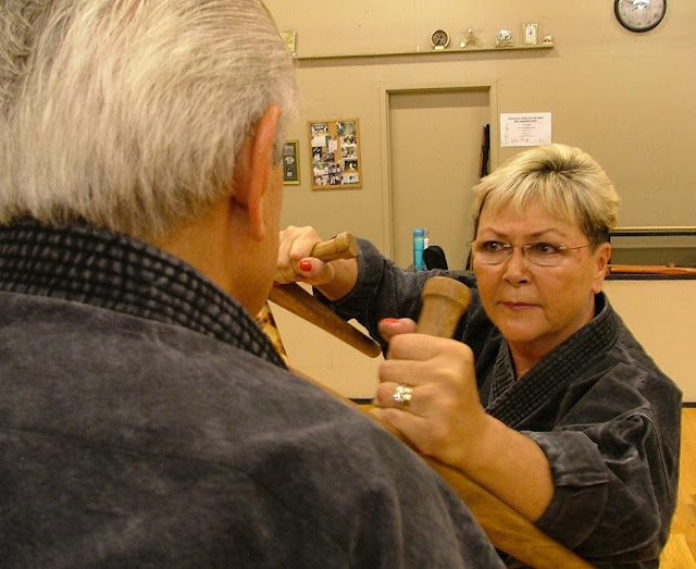 | Watch out Bill! Sensei Paula trains with tonfa at the Arizona School of Traditional Karate at Baseline and MacDonald, Mesa and Gilbert. |
